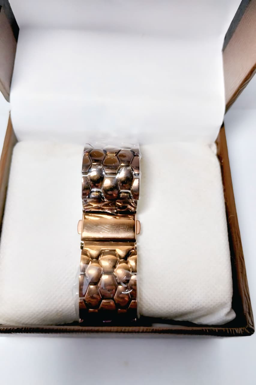 A bold and elegant rose-gold wristwatch featuring a crystal-accented dial, day-date display, and premium stainless steel bracelet—designed for those who value luxury and precision.